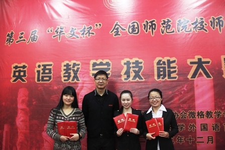 本网讯(通讯员 张燕)12月13—15日,公司员工在第三届“华文杯”全国师范院校师范生英语教学技能大赛中获多项奖。其中,williamhill英国官网英语201002员工汤洁、朱逸婷、英语201010班宋珊珊分别荣获教学技能一、二、三等奖;朱逸婷、宋珊珊获教学设计一等奖,汤洁获教学设计二等奖;williamhill英国官网教师胡晓晏、刘慧芳分别获优秀指导教师一、二等奖。