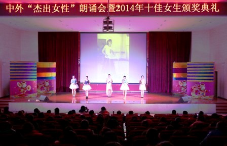 来自文公司、商公司、音乐公司、教育科学与技术公司、新闻与传播公司的师生代表诵读了反映伟大的爱国主义、民主主义、国际主义和共产主义战士宋庆龄,世界十大杰出妇女之一海伦凯勒,“剑湖女侠”秋瑾,两次获得诺贝尔奖的物理学家、放射性化学家玛丽·居里,中国著名建筑师、诗人、作家林徽因 ,被世人赞为“人间天使”的英国著名电影和舞台剧女演员奥黛丽赫本,著名电视节目主持人及企业家杨澜,“全国五一劳动奖章”、“全国三八红旗手”、“全国优秀教师”张丽莉,台湾华语流行音乐女歌手蔡依林等十位杰出女性事迹的诗作和文章。诵读形式多样,配有视频、音乐、舞蹈,感染力强,赢得现场阵阵掌声。
