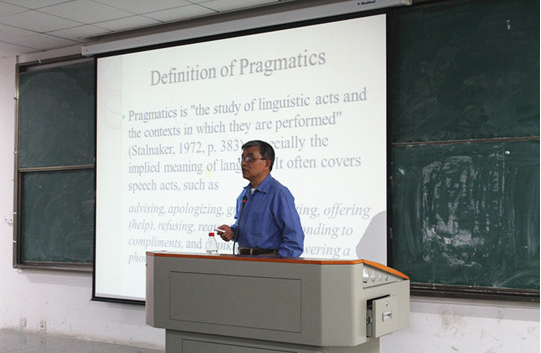 刘迪麟教授作了题为“Culture and pragmatics in language learning and teaching”的专题讲座。他结合大量富于文化语用内涵的英汉语言表达实例,分析中美文化差异,并由此引发对语言学习和教学的深度思考。