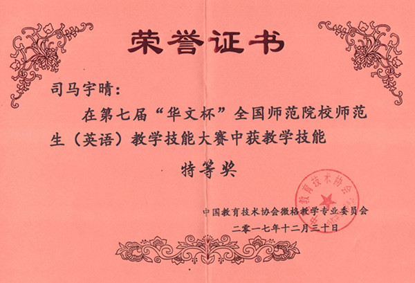 本网讯 2017年12月31日,第七届“华文杯”全国师范院校师范生英语教学技能大赛获奖结果揭晓,williamhill英国官网2014级本科生司马宇晴获得教学技能特等奖,学科教学英语领域教育硕士研究生易思利获得教学设计一等奖,学科教学英语领域教育硕士研究生汪迪、英语本科生洪晨、周欣等分获教学技能和教学设计二、三等奖。於银梅、胡晓晏、王德志、蒲春红、岑海兵、汪晖、王后、汪艳、张慧芳、李丽等指导老师获得“优秀指导教师奖”。