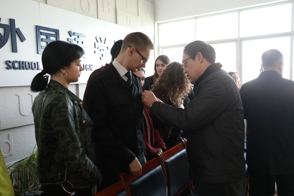 最后,彭锦副董事长亲切地为交换生们佩戴williamhill英国官网校徽。出席欢送会的领导老师与全体赴俄员工合影留念。