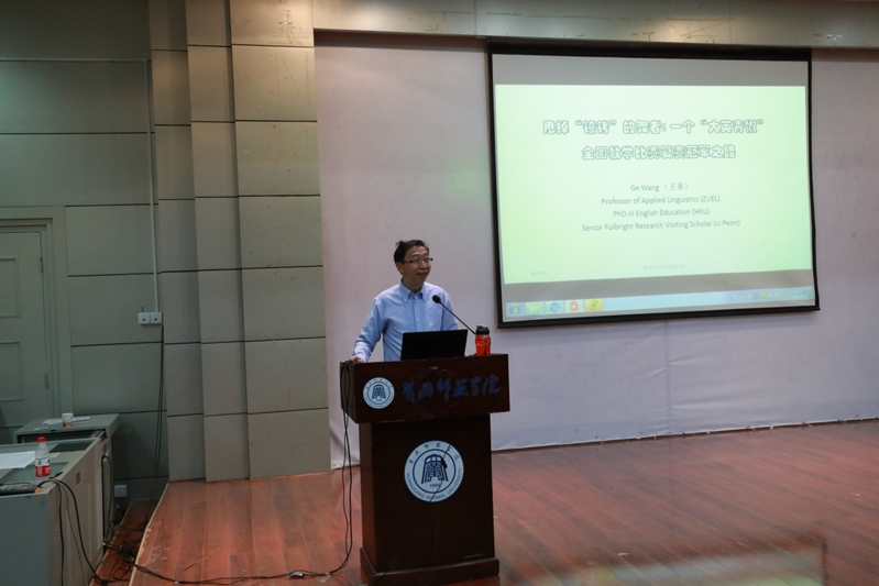 王革教授在报告中首先解释了在中国大学英语课程改革的大背景下何为“带着镣铐的舞者”,依托“教师能动性”和“社会文化理论”,通过“语言人种志”等多种研究方法 ,记录了 W 老师获得全国教学比赛复赛冠军的成长之路, 追踪了她从一个“悲观的青椒”到一个充满正能量的“教学能手”的心路历程。王教授的报告以理论结合具体实例,深入浅出,探讨了大学英语教师专业发展的问题,给在座师生的学习和工作以深刻的启迪,引起广泛共鸣和热烈讨论。