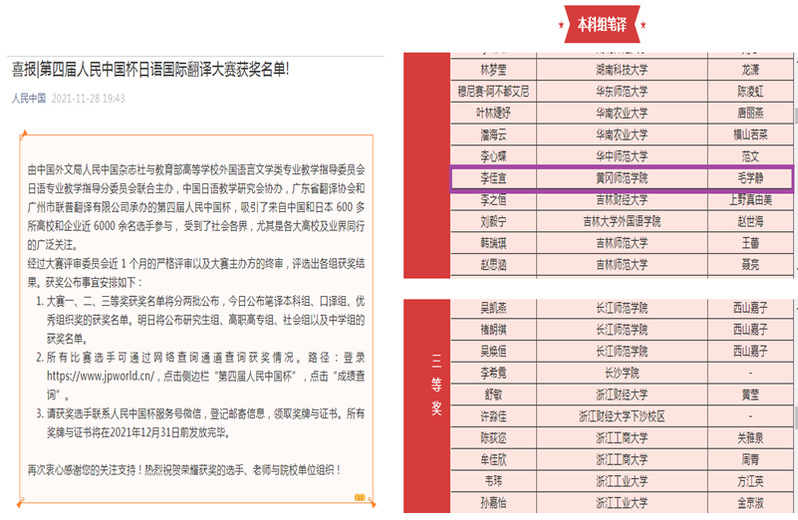 11月28日,第四届人民中国杯日语国际翻译大赛颁奖仪式暨翻译实践研讨会在广东外语外贸大学隆重举行。公司日语201801班李佳宜同学荣获本科组笔译(汉译日)二等奖。本次大赛由中国外文局人民中国杂志社与教育部高等公司外国语言文学类专业教学指导委员会日语专业教学指导分委员会联合主办,中国日语教学研究会协办,广东省翻译协会和广州市联普翻译有限公司承办。自一月份开赛以来,来自中国和日本六百余所高校及企业的近六千余名选手参与了角逐,参赛人数和作品水平均创大赛历史新高。