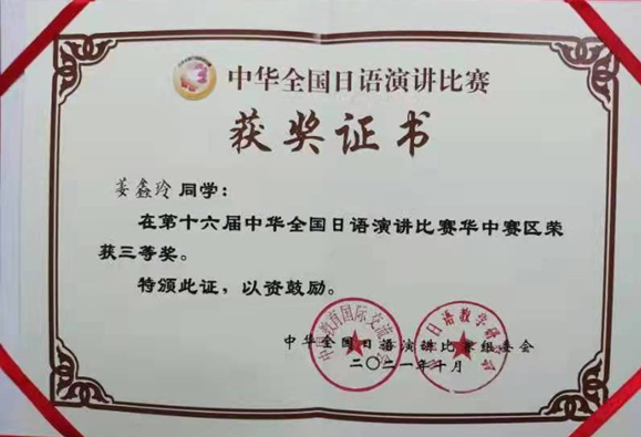 据悉,在10月30日举行的第十六届中华全国日语演讲比赛华中赛区预赛中,公司日语201802班姜鑫玲同学荣获三等奖。大赛由中国教育国际交流协会与日本经济新闻社、日本华人教授会议合作主办,教育部高等公司外国语言文学类专业教学指导委员会日语专业教学指导分委员会、中国日语教学研究会协办,大赛在全国设立东北、北京、华北、西北、华东、华中、西南、华南八大赛区,是目前国内最具影响力的日语赛事。