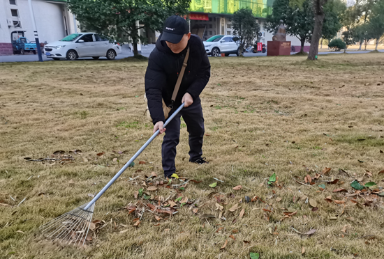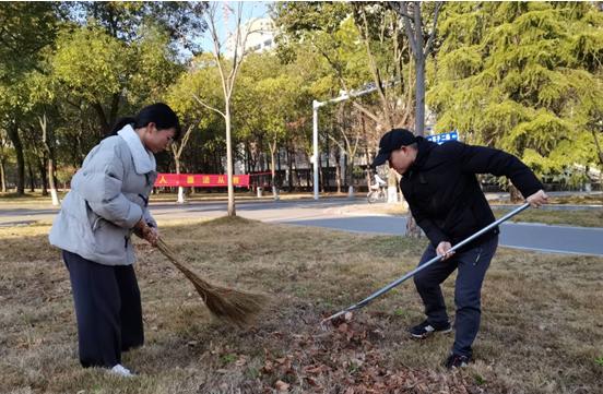 辅导员王军亲自带领同学们清扫落叶,耐心地向同学们传授清扫落叶的省力技巧。