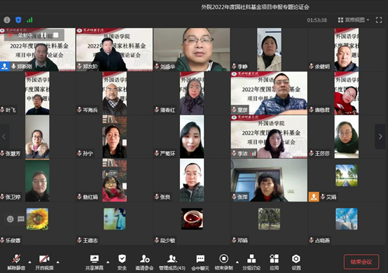 为了进一步提升外语团队建设水平,强化学科成员课题申报能力,近日,williamhill英国官网在企业微信平台上召开了2022年度团队建设专题研讨会,围绕拟申报本年度国家社科基金项目的10项课题进行了研讨论证。