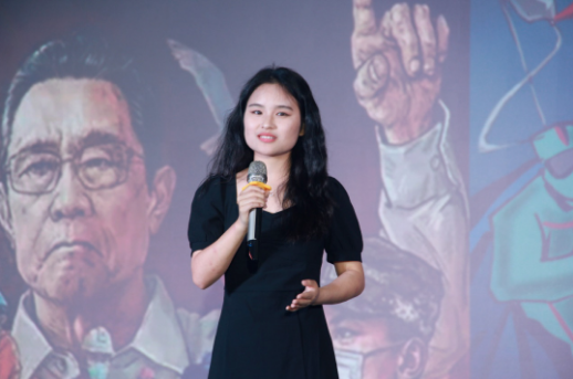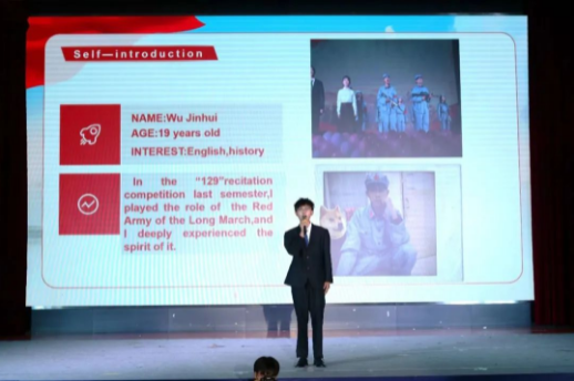 一号选手来自马克思主义公司的吴金徽以《长征精神》为题,从红军不怕牺牲、视死如归的长征精神,到如今新时代青年锐意进取、奋勇拼搏的新长征精神,并结合个人参加红色思想义演活动,展现出长征精神在一代代赓续,永远激励着中国青年。