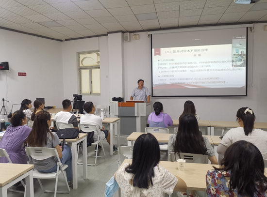 郑友阶副经理作了学术规范与学风建设的专题报告。他从学术诚信的必要性、学术不端的危害和典型案例、学术规范以及相关文件和制度等四个方面展开。特别就抄袭和剽窃作了区分。最后就研究生应该遵守的哪些学术规范做了总结。