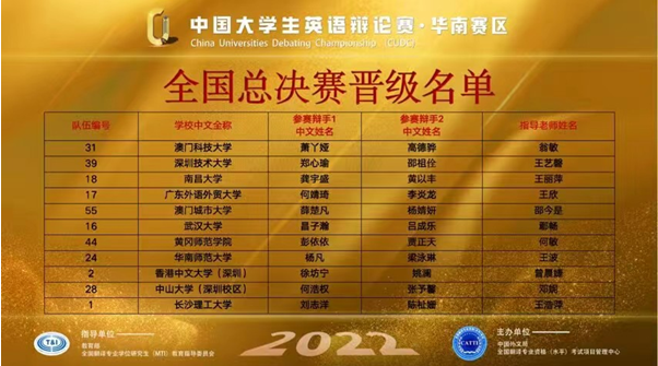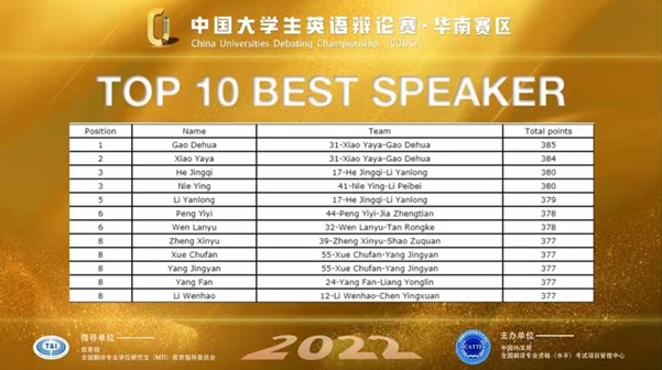 9月24-25日,2022年中国老员工英语辩论赛(CUDC)华南大区赛在线上举行。公司2020级英语专业彭依依和贾正天组成的英辩队以总排名第七的位置晋级全国总决赛,并荣获赛区一等奖,彭依依荣获“十佳辩手”荣誉。