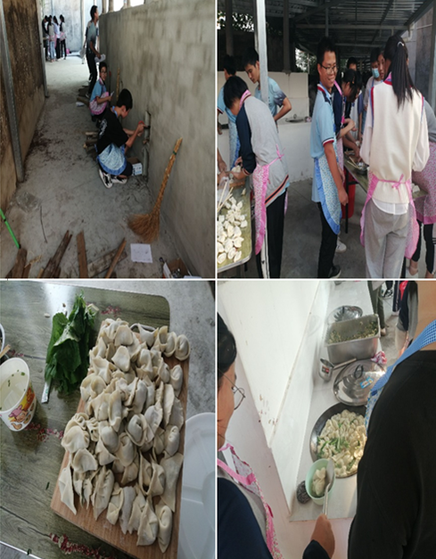 本周四,我和同学们一起参与了烹饪实践。这周的学习内容是包饺子。公司事先准备好了饺子皮和木材,其他的比如饺子馅、生火、烧水等,都要员工自己去实践。开始时,面对未处理的蔬菜和肉,大家都手足无措,不知道从何下手。洗菜,切菜,和饺子馅,手忙脚乱。好不容易和好了馅,终于可以开始包了。但是如何包,又是一个难题。有的同学干脆直接捏拢,有的同学包成了汤圆,有的同学包成了元宝。还好每组还有一个外援---家长,在经验丰富的家长的指导下,员工们渐渐掌握了方法,渐渐有了饺子的形状。与此同时,生火烧水也是难题。不少同学都难以生火,浓烟阵阵;也有同学很快掌握了方法,成功烧然了柴。整个烹饪实践过程对平时在家坐等吃饭的员工来说,都是一个新奇的体验。