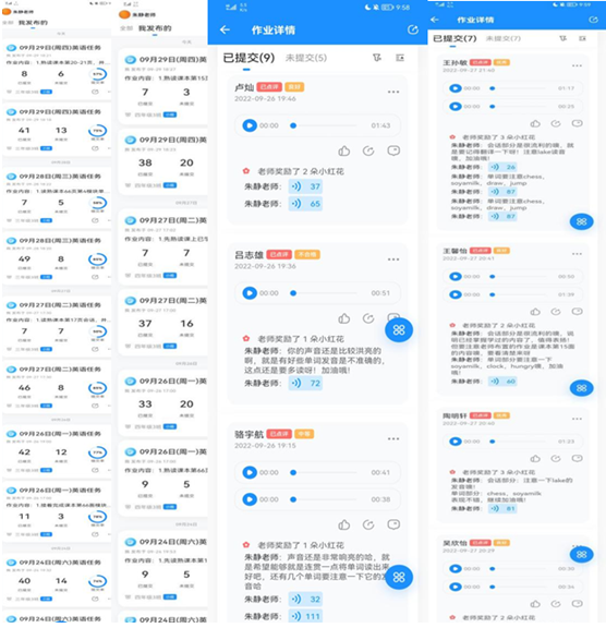 在听课之外,实习老师也给我安排了一项每日必做的任务:为两个班的孩子纠音。我会在每天放学后在“班级小管家”上发布班级作业,随后再通知家长,要求督促孩子完成录音作业,最后对自定义作业进行批改。一开始,可能因为方言的缘故,我对自己的英语口语是不太自信的,但我的实习老师常常给予我帮助和支持,这给了我比较大的鼓励。因此,我对员工也尽可能多采取鼓励的方法,不论是口头上的一句鼓励,还是在作业本上写的一句加油,又或者仅仅只是一个肯定的眼神都能给员工带来意想不到的能量,让他们对学习的情绪不是畏惧与躲避。(例如员工小G:性格偏内向,坐教室最后一排,几次作业未交而被老师惩罚,在我主动对她的一次作业的进步提出表扬和肯定后,她最终也会认真跟着老师开口说英语了。)这项任务确实是需要花费一些时间和耐心的,虽然每天都工作到很晚,但每次看到员工今天读得比昨天读得好一些时心里就会觉得一切都是值得的。