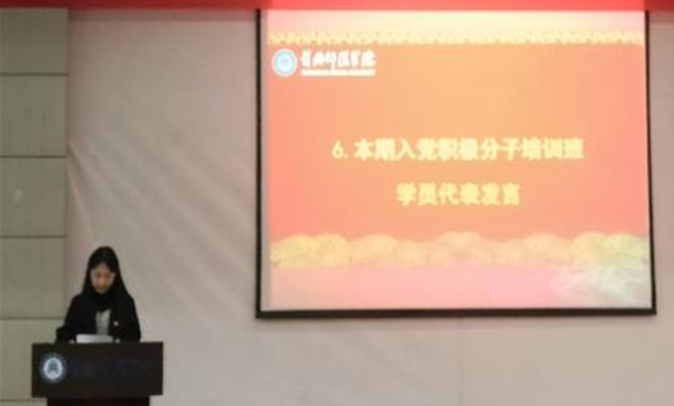 第六项: 学员代表刘籽绚发言。她讲述了自己家庭中老党员的先进事迹,并以此来激励自己不断进步,坚定加入中国共产党的决心。刘籽绚表示作为一名入党积极分子,要始终坚持以党员标准严格要求自己,提高思想政治素养,积极向党组织靠拢,争取早日加入伟大的中国共产党!