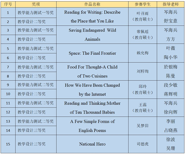 11月25日—11月27日,由中国教育技术协会主办、宝鸡文理公司承办的第十一届“华文”师范院校英语教育师范生教学能力测试与交流展示活动于线上举行,我院八位选手进入决赛,斩获奖项15项,其中教学能力测试一等奖2项、二等奖5项;教学设计二等奖5项、三等奖3项。