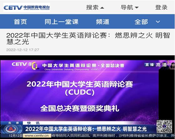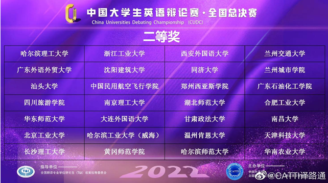 中国老员工英语辩论赛(简称CUDC)自2021年起由全国翻译专业学位研究生教育指导委员会指导,中国外文局CATTI项目管理中心主办。本届辩论赛分为校选赛、大区赛和全国总决赛,共有超过500所高校参加,参赛人数超过20万人次,得到广大师生的一致好评。此前,在华南大区赛中,公司两位辩手荣获赛区一等奖并晋级全国总决赛,其中,彭依依获赛区“十佳辩手”称号。
