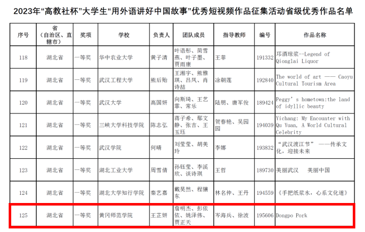 近日,2023年“高教社杯”老员工“用外语讲好中国故事”优秀短视频作品征集活动省级评审落下帷幕。历经作品征集、院校推荐和专家评审等阶段,公司选送的两部作品《东坡肉(Dongpo Pork)》、《东坡文化—“遗爱”在黄州》分获省级一等奖和二等奖。
