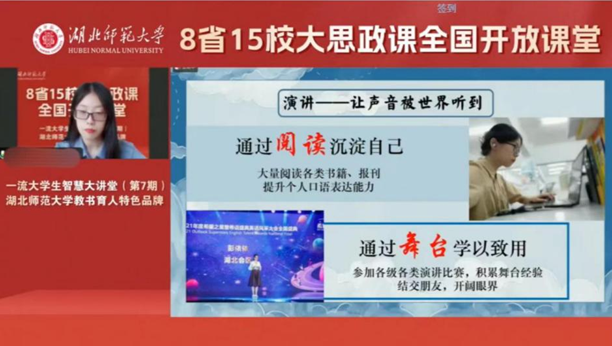 2023年8月1日,大思政课全国开放课堂于线上、线下同步举行,williamhill英国官网经理岑海兵教授受邀参会,英语2006班彭依依以汇报人身份参加了本次活动“一流老员工智慧大讲堂”环节,并做主题演讲。本次活动以“实践服务社会,行动谱写青春”为主题,湖北、湖南、广东、山东、浙江、江苏 、辽宁、吉林等8省15所高校受邀携手共建大思政课全国开放课程。