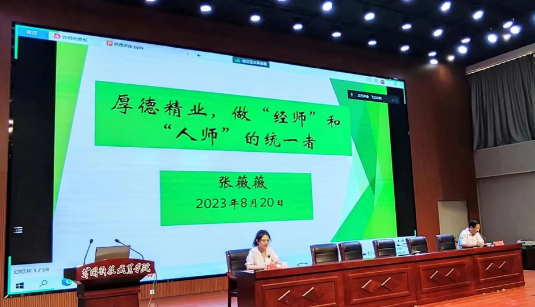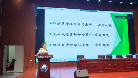 在当日举行的师德师风教育模块,公司副教授,教师发展工作室主任张薇薇作以唯一的校外专家身份受邀以“厚德精业,做“经师”和“人师”的统一者”为题,从教师困境分析、个人成长路径、专业成长路径、师德实践路径四个方面和参训教师们探讨高校青年教师加强师德师风建设路径。