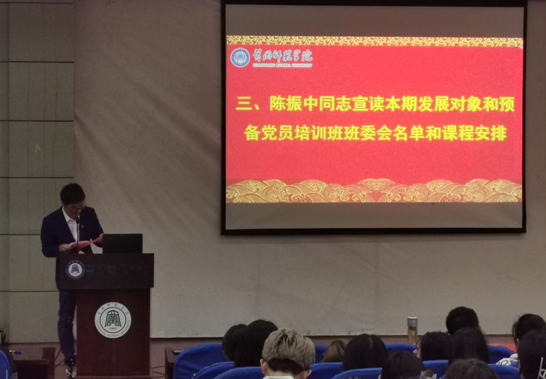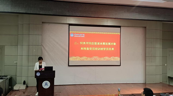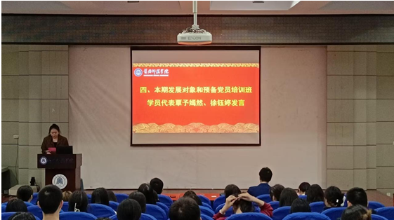 第四项 学员代表覃予嫣然、徐钰婷发言。学员徐钰婷代表全体学员向党组织承诺:第一,进一步端正入党动机,时刻提醒自己入党是为了什么,入党以后要干什么,严格地以党员标准要求自己,为成为一名名副其实的共产党员而努力;第二,在学习过程中,端正学习态度,严格遵守党校纪律,积极配合党校老师,以严谨的态度做好培训中的每一个环节;第三,在培训过程中,努力学习,进一步增强对党的了解,提高自己的思想水平和政治素质,更加坚定共产主义的理想和信念;第四,在学习的过程中及培训后,努力将理论学习和社会实践相结合,创新地开展社会实践活动,自觉向周围同学宣传党的知识和各项方针政策。