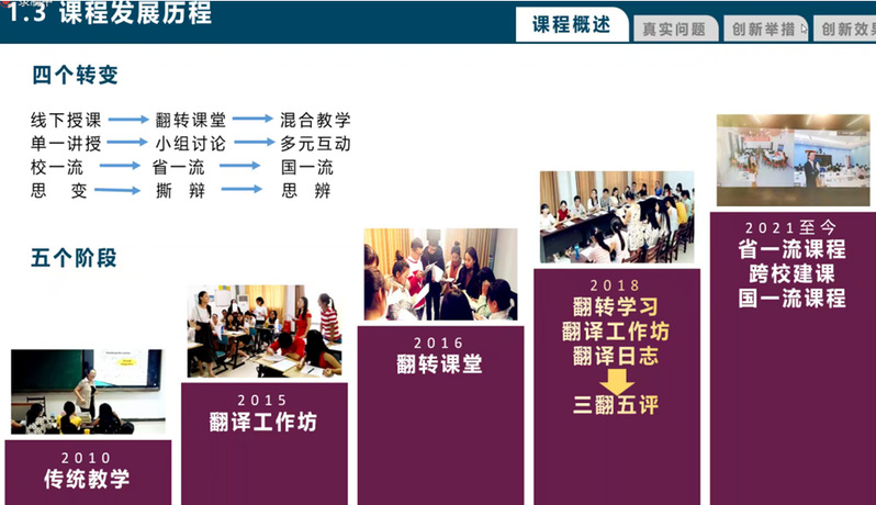 本次活动由讲座、磨课两部分组成。张薇薇以《“三翻五评”深度学习 培养数字时代思辨性翻译人才》为题做主题报告,结合《翻译技巧与实践》国家一流课程实践案例,提出构建以思辨导向的“三翻五评”深度学习模式,通过翻转学习、翻译工作坊、翻译日志的“三翻”以及小组内、组间、班级、教师、自我的“五评”,培养数字时代敏于探究、尊重事实、具有开放思想的思辨型翻译人才。讲座结束后,主办方邀请来自北京大学、上海交通大学、山东大学、西南交通大学、华南理工大学、宁波大学的六位专家对课程进行点评,详细分析课程设计的各个环节,并就如何进一步优化课程开展深入探讨。