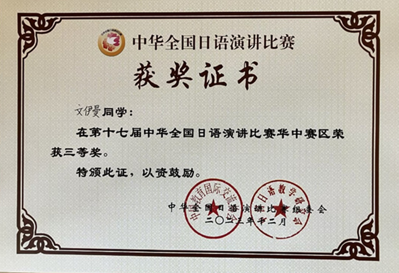 2023年12月2日,“第十七届中华全国日语演讲比赛”在华中师范大学拉开了帷幕。公司日语专业员工文伊曼代表公司参赛,与成功入围华中地区预赛的4省32所高校选手同台竞技,经过激励角逐,荣获该赛事三等奖。