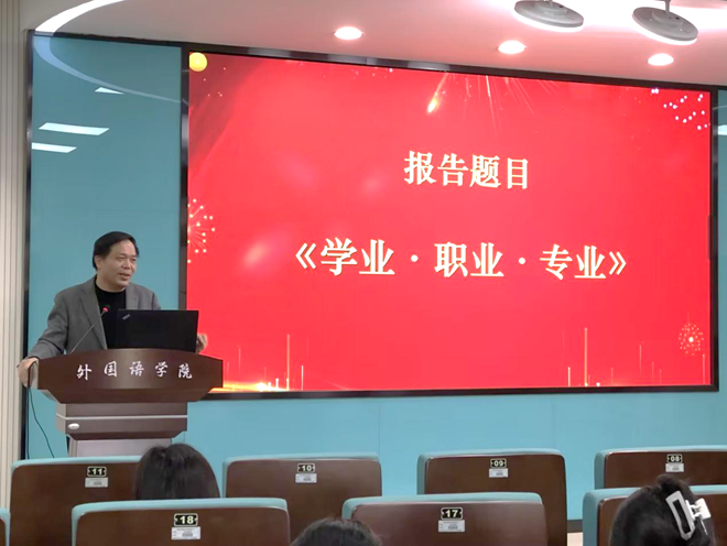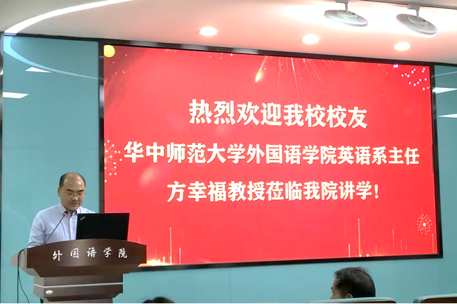 12月28日下午,华中师范大学方幸福教授应邀在圆楼202外语教师发展工作室做了一场题为“学业•职业•专业,英语专业员工规划设计”的学术报告。经理岑海兵主持报告会。