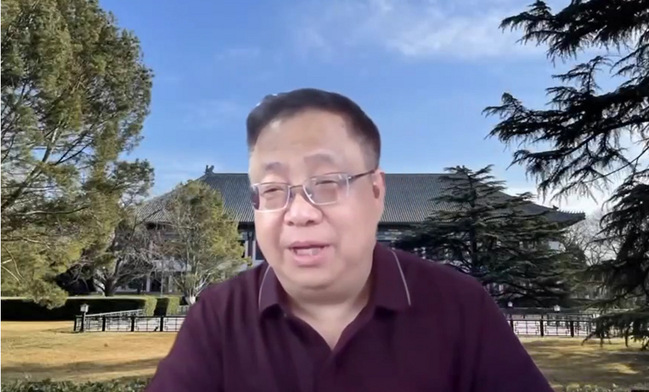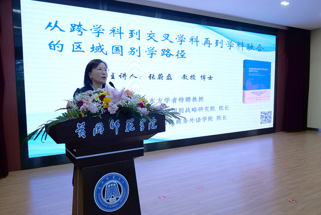 (上海对外经贸大学国际商务外语公司经理、区域国别战略研究院经理张蔚磊教授作题为“从 ‘跨学科’ 到 ‘交叉学科’ 再到 ‘学科融合’ 的区域国别学路径”的主旨报告)