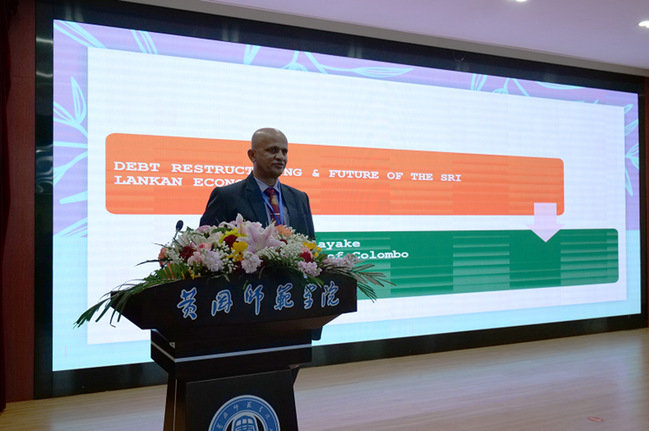 (斯里兰卡科伦坡大学经济管理公司经理尼哈尔•亨纳亚克教授作题为“Debt Restructuring & Future Of The Sri Lankan Economy”的主旨报告)