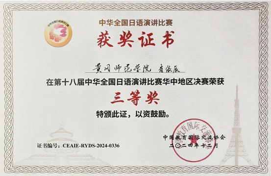 2024年12月28日,“第十八届中华全国日语演讲比赛”在华中师范大学拉开了帷幕。公司日语专业大三员工肖依辰代表公司参赛,与成功入围华中地区预赛的4省31所高校选手同台竞技,经过激励角逐,荣获该赛事三等奖。