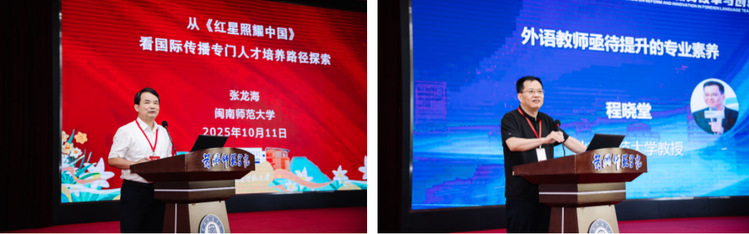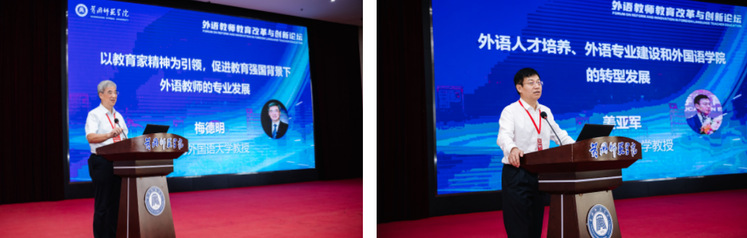 论坛共设置八场高水平主旨报告。上海外国语大学梅德明教授提出以教育家精神引领新时代外语教师队伍建设,推动教师专业成长;西安外国语大学姜亚军教授呼吁推进外语教育供给侧结构性改革,构建中国特色外语人才培养体系;闽南师范大学张龙海教授以《红星照耀中国》的国际传播实践为例,探索“三位一体”的外语人才培养路径;北京师范大学程晓堂教授指出,当前外语教师在语言意识、学科教学知识与研究能力等方面仍需系统提升;华东师范大学杨延宁教授聚焦人工智能在外语教学中的应用难点与实践场景,提出具体解决方案;华中科技大学徐锦芬教授从课程体系、项目教学、实习教研共同体、评价体系四方面提出师范生教研意识培养路径;华中师范大学罗良功教授从观念重构、课程重建、资源建设等方面阐述外语教师教育的中国资源开发与利用的本土化改革道路;南开大学张文忠教授聚焦乡村振兴,提出开设“智慧英语教育”微专业,强化农村团队支撑。