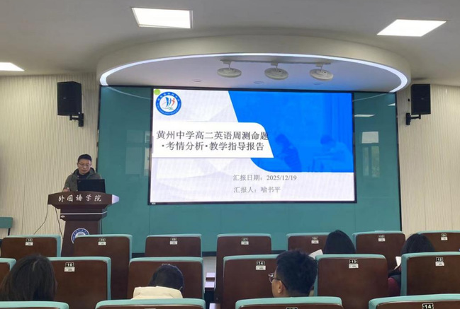 12月17日的讲座以“黄州中学高二英语周测命题·考情分析·教学指导”为主题。喻书平老师以一套完整的周测试卷为切入点,系统解析了试卷命题思路、考点设置与能力指向,并结合真实考情数据,深入剖析员工在不同题型中的常见问题与能力短板。在此基础上,喻老师进一步提出针对性的教学调整建议,生动展示了如何通过考试数据诊断教学成效、反拨课堂教学改进。讲座帮助研究生直观理解了命题与教学之间的内在联系,加深了对教学评价功能的认识。
