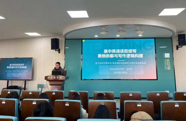为进一步深化研究生对高中英语教学实践与评价改革的理解,2025年12月17日和12月26日下午,黄州中学英语教师、行业导师喻书平应邀两次走进公司课堂,为2023级学科教学(英语)专业研究生开展专题讲座。两场讲座主题鲜明、内容扎实,分别从英语测试命题分析与读后续写写作教学指导两方面展开,紧密对接高中一线教学实际,受到师生广泛好评。